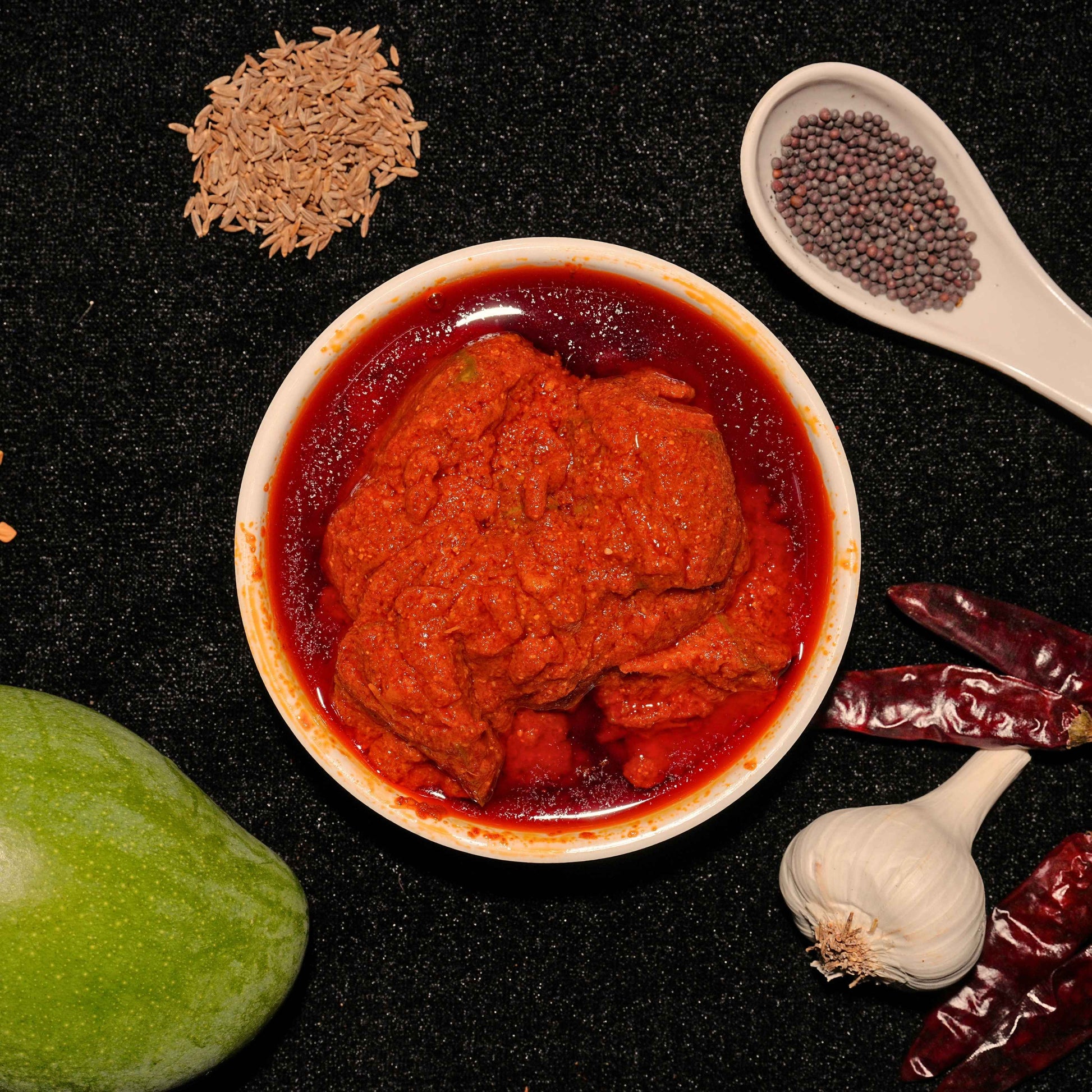 A classic from the heart of Andhra cuisine, our Avakai pickle combines the boldness of sun-dried red chillies with the tang of handpicked raw mangoes. Blended with a delicate mix of traditional spices, this pickle delivers an authentic, well-rounded flavour that complements every meal.