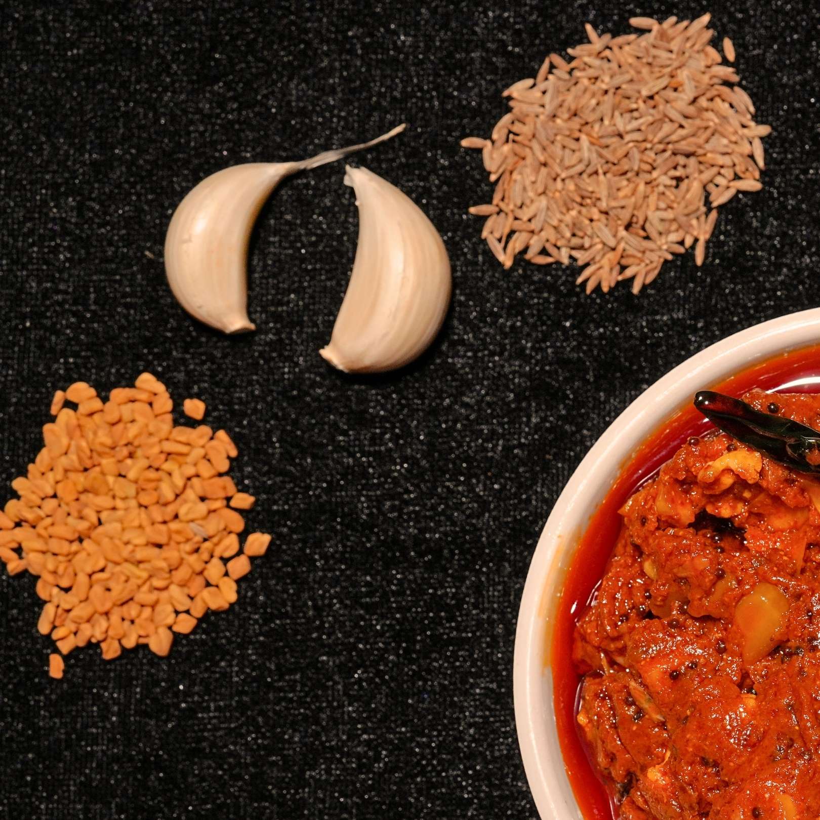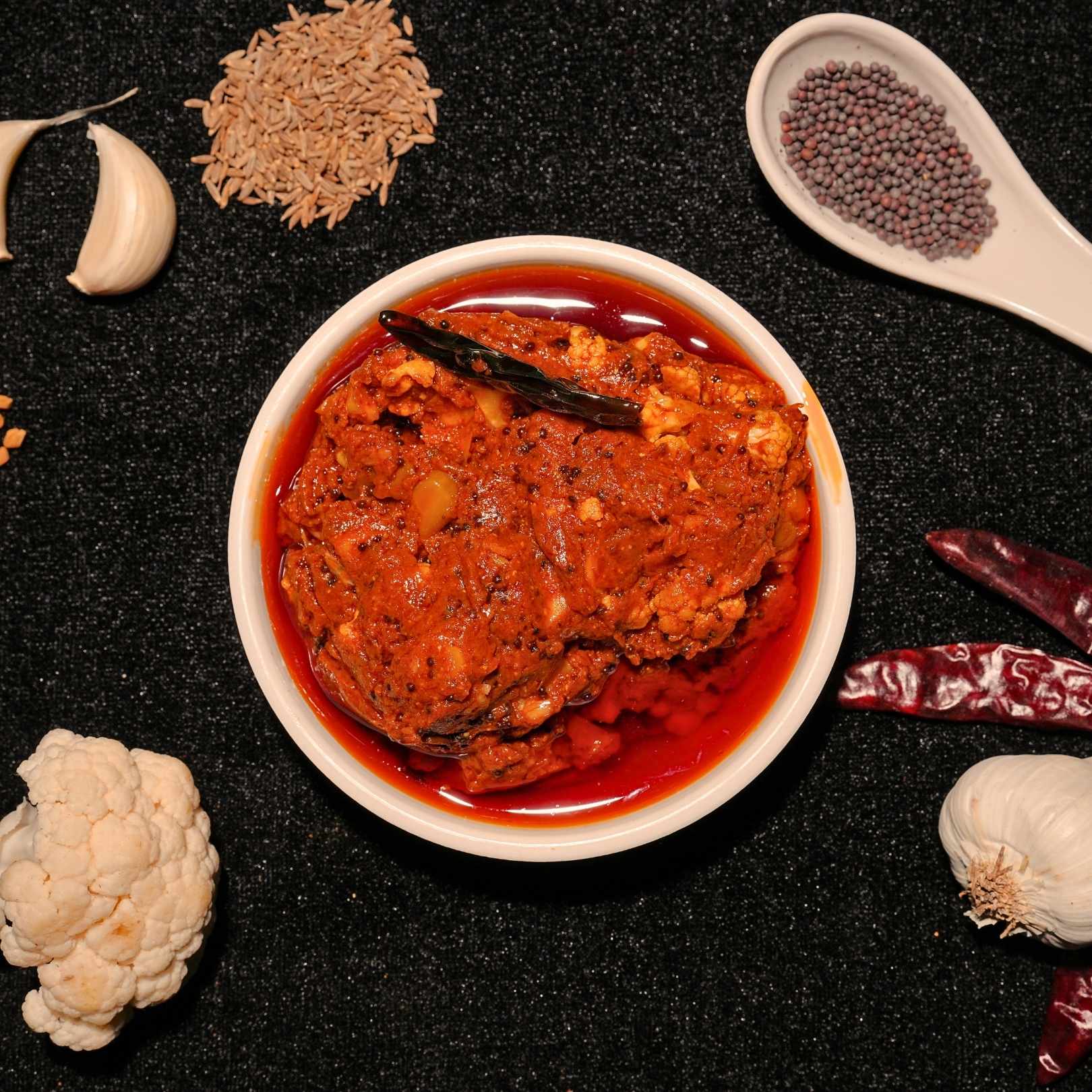 Crisp cauliflower florets are soaked in a lively mix of red chilli, mustard and spices. The result is a flavour-packed pickle with a satisfying crunch and vibrant aroma.